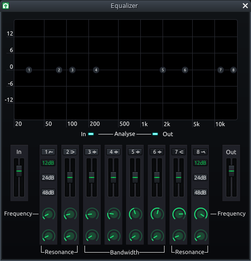 The bubbles on the graph can be used to plot Cutoff frequency* and Gain*. Using the scroll wheel on these filters will alter their Bandwidth/Resonance*. *These terms are explained in the Filter Settings subsection of this page.