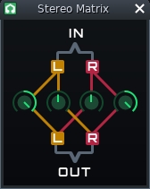 This plugin allows you to reroute the Left and Right channels of an input signal. This is accomplished by splitting the input into 4 channels whose amplitudes can be adjusted with their respective knobs.