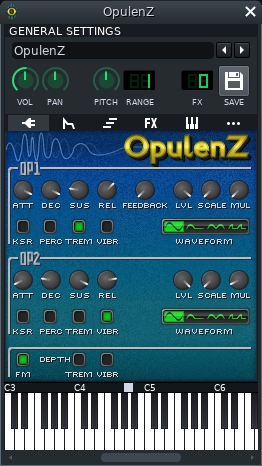 OpulenZ is an emulation of the Yamaha YM3812, a.k.a. OPL2, FM synth chip which was used i sound cards around 1990 - the Adlib and Sound Blasters. It generates sound through frequency modulation or adding 2 oscillators.