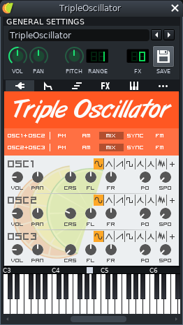The TripleOscillator plugin is a synthesizer which generates sounds by combining the waveform of up to three function generators.