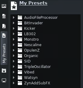 您可以在侧边栏预览预设的音色，方法是直接左键按住想预览的预设的文件名。预览会在您的鼠标离开该预设或预设播放完毕时停止。