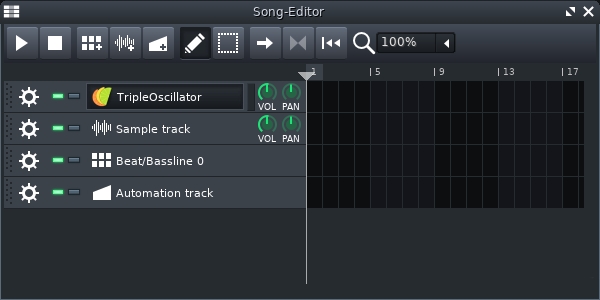 The Mute/unmute toggle looks like a green light that you turn ON and OFF by clicking on it. Use it to turn off the sounds from this track temporarily. For example, you may want to hear the track of an accompanying instrument without hearing the lead instrument. As all knobs, lights and faders in LMMS these can be automated. The Solo/unsolo toggle is the second light, the one to the right. It is a red light that you turn on and off by clicking on it. Use it to turn off temporarily all the other tracks except this track, or add some other tracks to the playback, simply by un-muting any track of your own choice. That way you can have one solo track plus any number of selected tracks playing together alone. When you want to have all tracks active again, you simply unsolo the solo track. That will unmute all tracks in your Song Editor again.