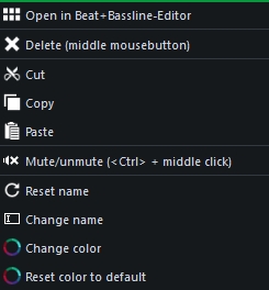 Change color allows you to change the color of the segments in the BB track. This helps you to distinguish the function or content of the tracks by their color, and helps you to quickly know which bassline you are dealing with in a complex rhythm sections. You can use the edit mode tool aka selection tool to select a group of Beat/Bassline segments and color them all at once.